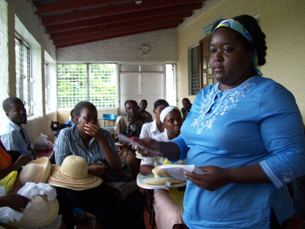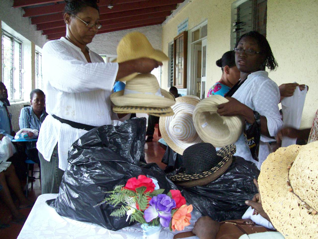 Pastor Wallas distributing hats to pastors wives