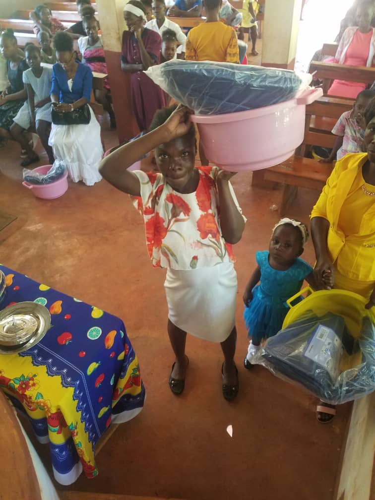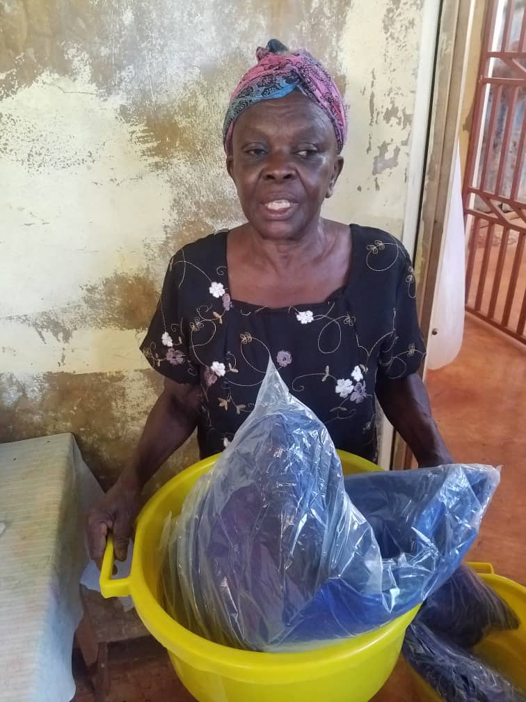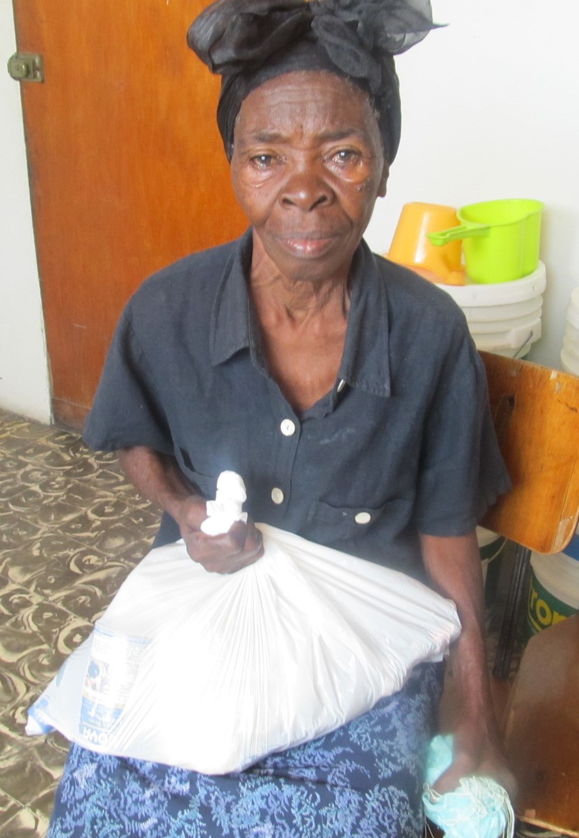 Haitian woman receiving a tarp and a water basin.