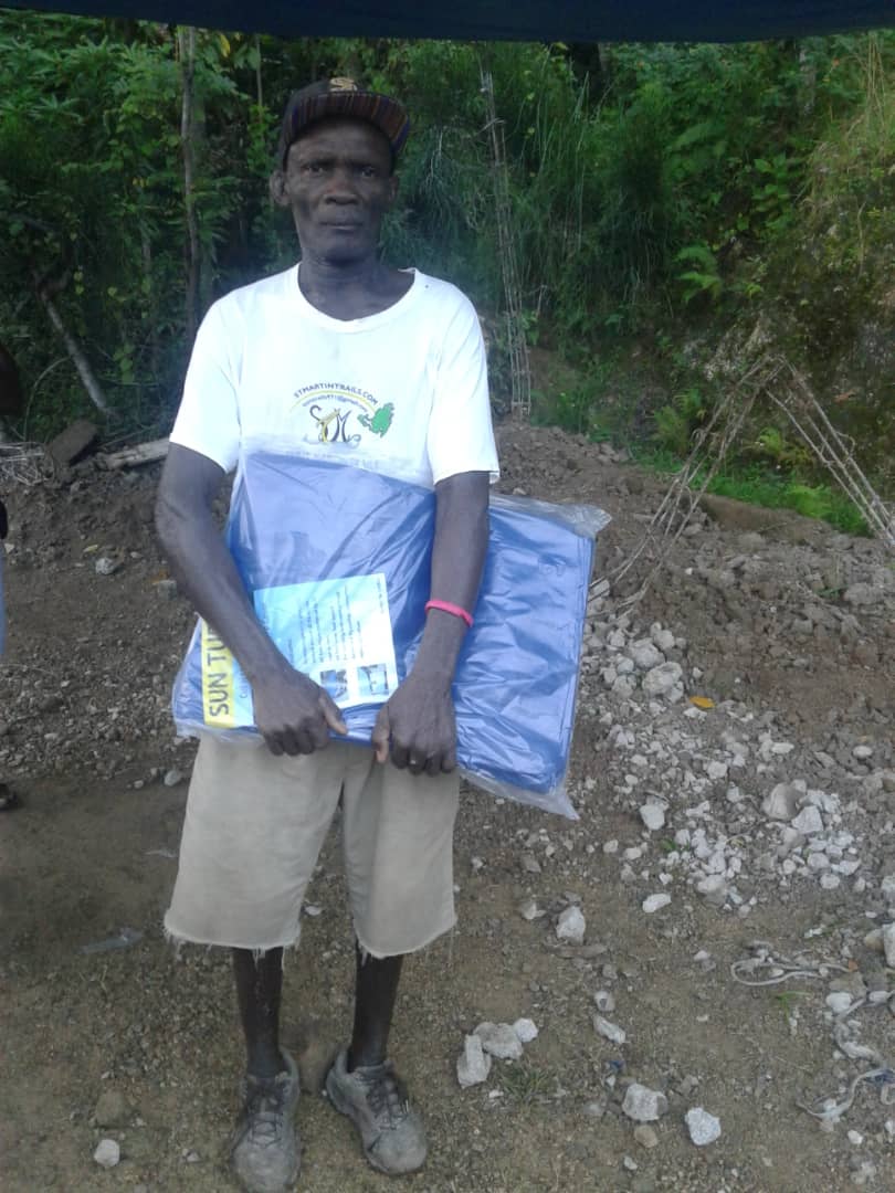 Haitian man receiving a tarp.